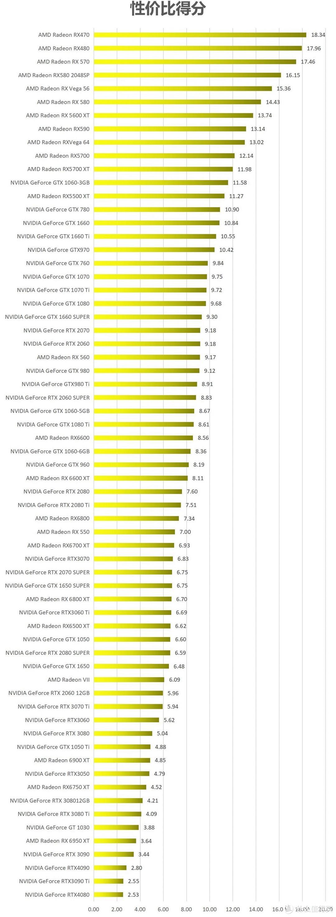 4、性价比得分是用显卡跑分除以显卡价格得到的分数,趋于片面,无法针对于个人喜好来计算得分。