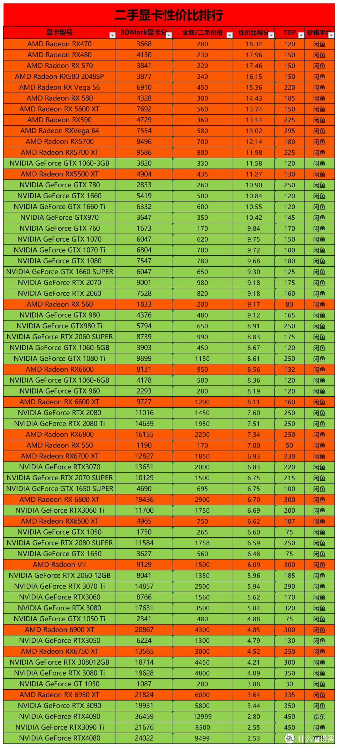 3、显卡价格是12月初遍历闲鱼及各大平台所选择的,不排除你能捡漏,价格暴降暴涨等因素导致的价格失效等问题,同时你也可以根据公式自己测算性价比得分,代入到我的表格中,看看你的价格是否合适。