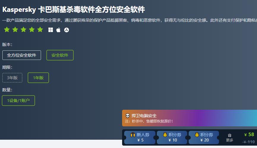 那么如何便宜购买卡巴斯基激活码呢?答案是通过国内正版软件商城。比如软购最近发布了促销活动,只需要58元就能买到卡巴斯基安全软件。