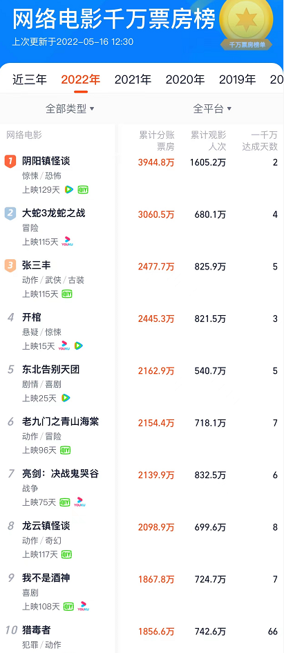 这次的《阴阳镇怪谈》也拿到了2022年度上半年的票房冠军,而且超出第二名近1000万。