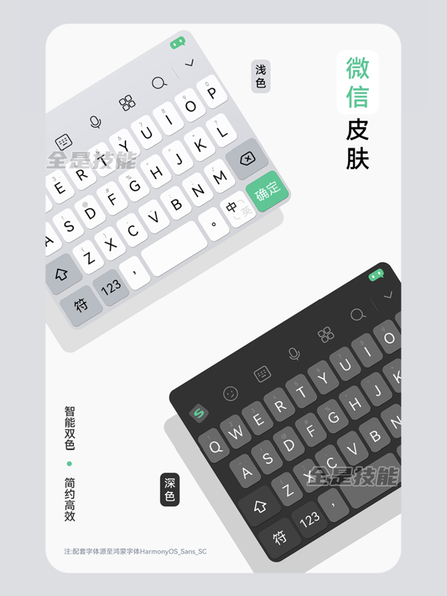 这款皮肤采用和微信键盘风格相近的简约风,搭配经典的灰绿配色,还有左上角显眼的大Logo,同时适配深色模式,乍一看几乎能以假乱真。