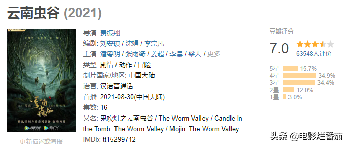 《云南虫谷》豆瓣评分3.2分,猫眼评分也只有5.6分,可见品质有多低劣。