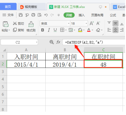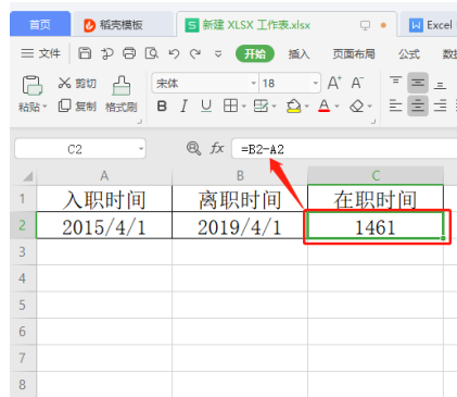 在excel中,两个日期直接相减就可以得到两个日期间隔的天数,如下图【B2】与【A2】之间的时间差只需要在【C3】中输入=B2-A2就得出了在职时间的天数。