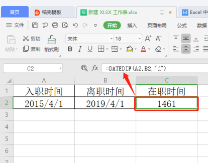 或者输入天数间隔差函数=DATEDIF(A2,B2,”d”),也可得到在职时间的天数。