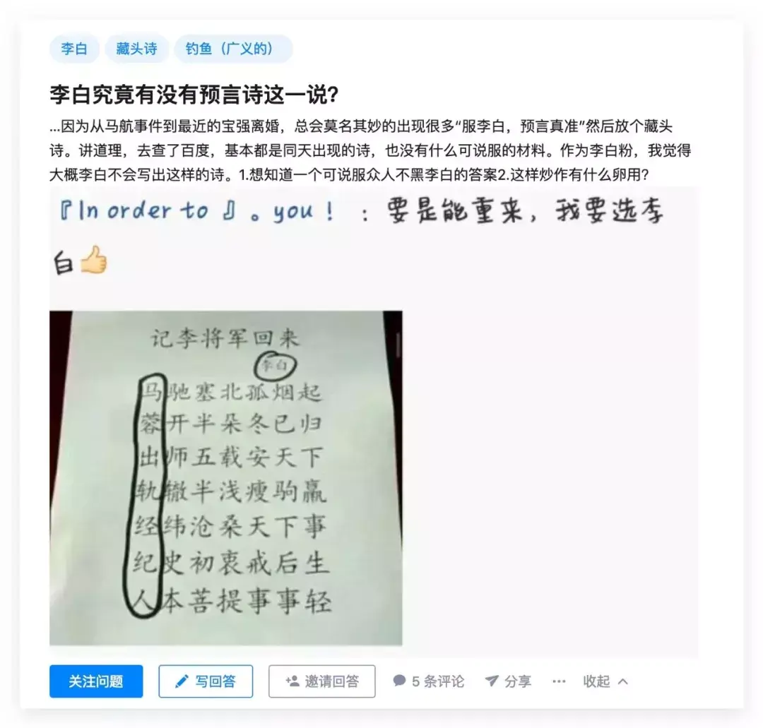 如果你经常玩互联网的话,应该知道前几年特别流行「李白预言诗」,用于解释各种扑朔迷离的现象,比如马航失联,比如马蓉出轨。