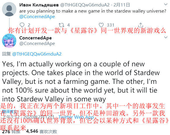 《星露谷物语》制作人 Eric Barone 在 Twitter 上与玩家交流时透露,目前他手头有两个正在开发中的项目,其中一个与《星露谷物语》处于同一世界观(但不是种田游戏),另外一款则会以某种方式和《星露谷物语》建立联系。