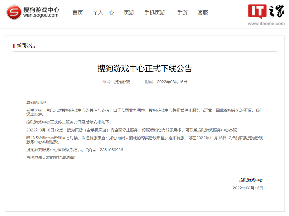 搜狗游戏中心官网8月16日发布公告称,由于公司业务调整,搜狗游戏中心将正式停止服务与运营。2022年8月16日12点,搜狗页游(含手机页游)将全面停止服务。公司将协助用户与游戏官方对接,沟通转服事宜;如客户有尚未消耗的购买游戏币且决定不转服,可在2022年11月16日12点前联系搜狗游戏服务中心客服退款。