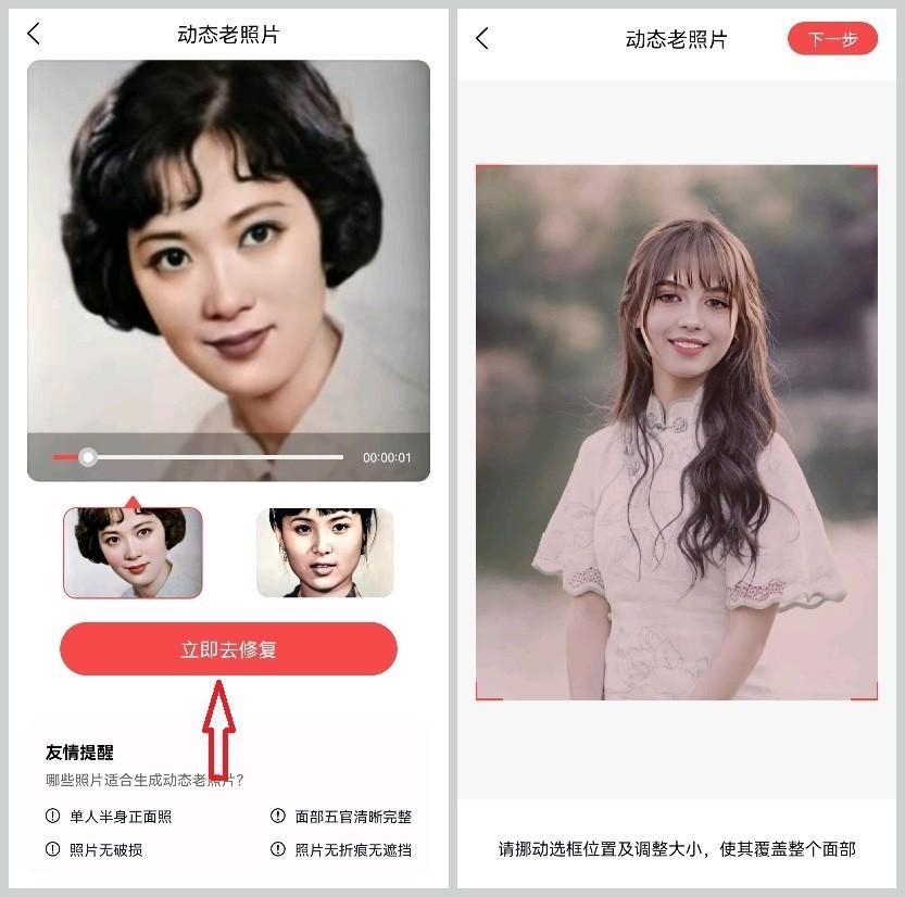 点击【立即去修复】之后我们导入相册的照片,裁剪画面之后点击【下一步】,在等待片刻照片就变成“会动的”了,最后保存到手机里即可。