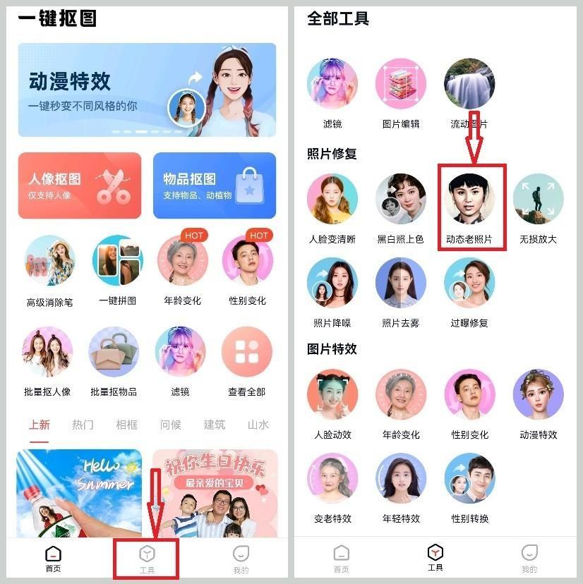 在制作动态图片之前,需要准备好制作的图片素材,最好是高清晰度的图片。我们打开之后点击【工具】往下翻找到【照片修复】中的【动态老照片】功能。