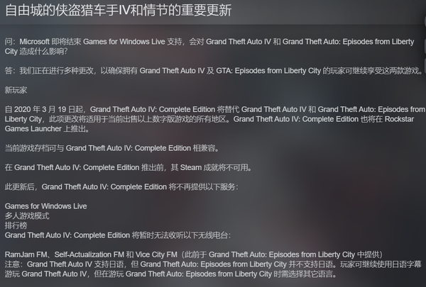 官方公告显示,《侠盗猎车手4:完整版》将取代原版和《自由城之章》,并且原游戏的存档可与完整版兼容。不过在完整版推出之前,其Steam成就将不可用。而且此次更新之后将会移除多人模式和排行榜,以及部分无线电台将无法使用。