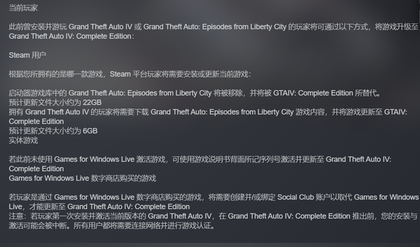 关于旧版本的升级,在 Steam 购买的用户将可以直接升级至完整版,而未使用 Games for Windows Live 服务的实体版用户可以直接激活升级至完整版,使用 Games for Windows Live 的用户则需要绑定 Rockstar Social Club 来升级。虽然有点麻烦,但有时玩老游戏就是要付出代价。