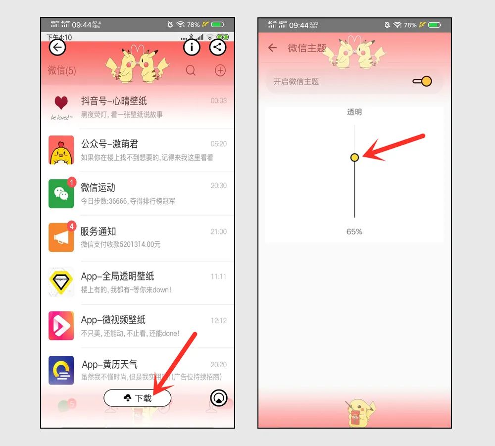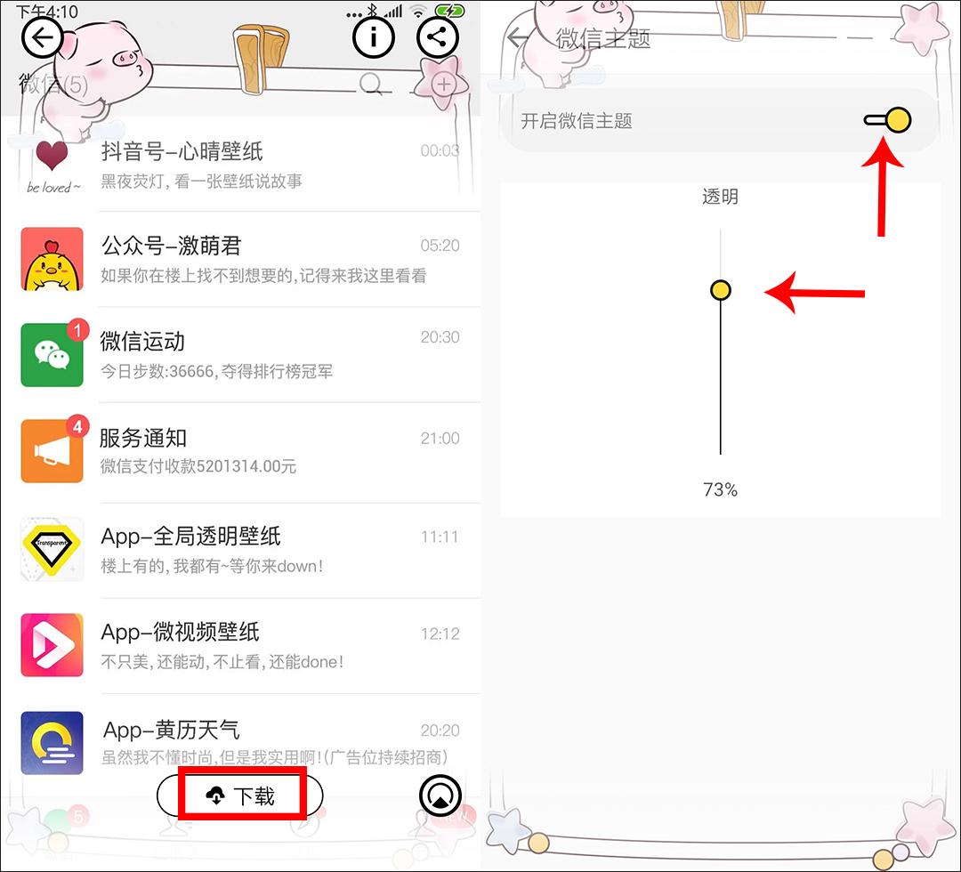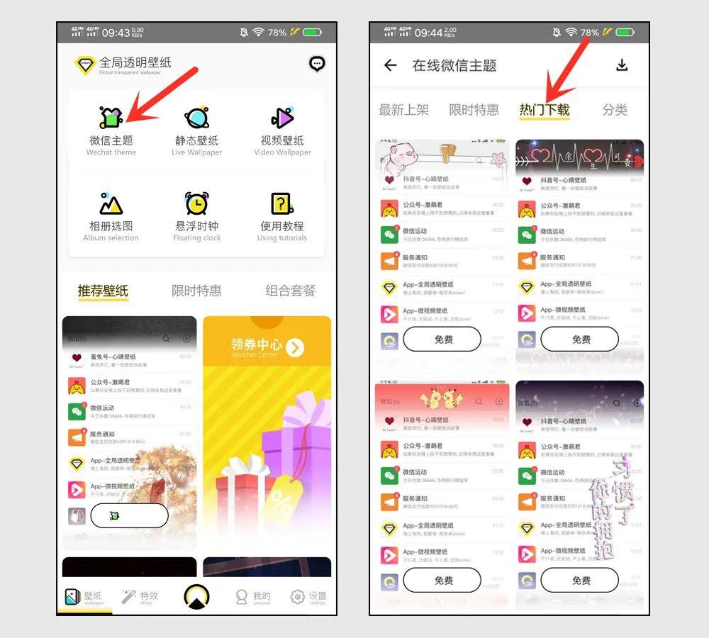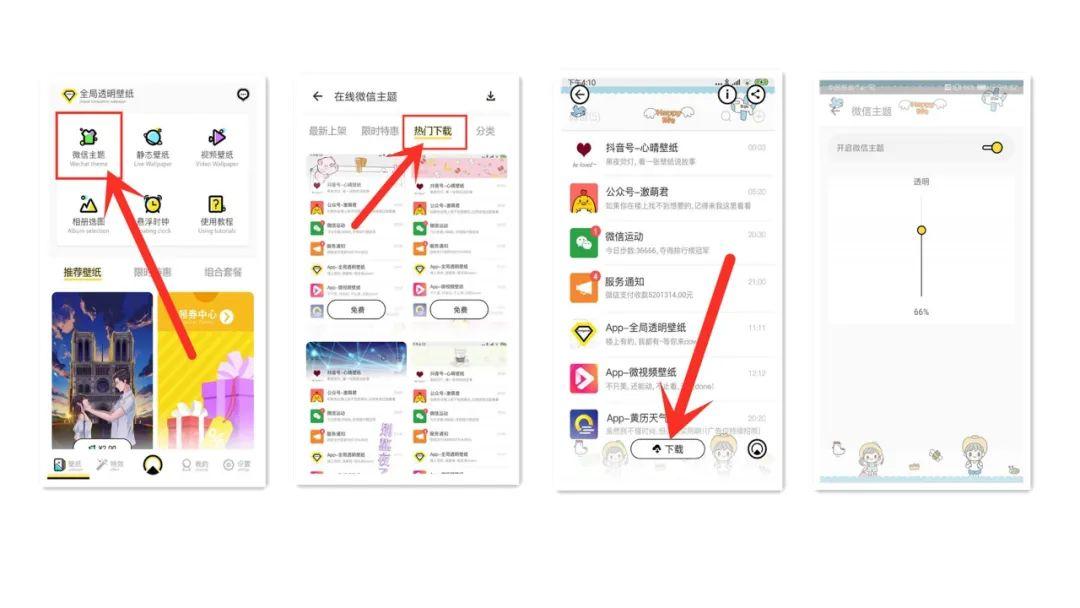 安装 一下点击打开 ,选择上方的微信主题 ,然后点击后面的热门下载 ,这里面呢就都是免费的主题,大家喜欢哪个,点击下载 一下就可以啦,同时呢还可以调节透明度 ,选择一个自己习惯的透明程度。