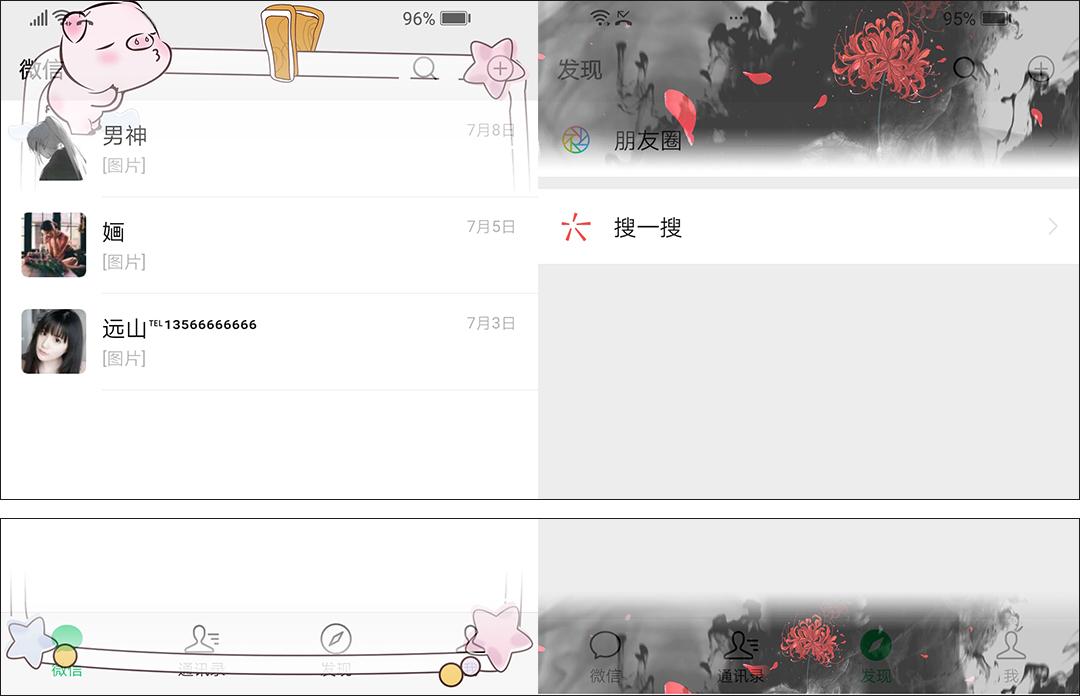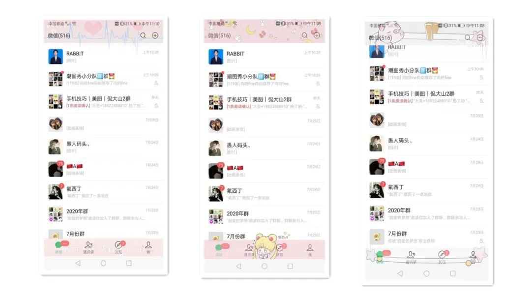 大家好,最近看见朋友们的微信主题竟然和我的不一样,他们的微信主题五花八门,什么样的都有,就像下面这样: