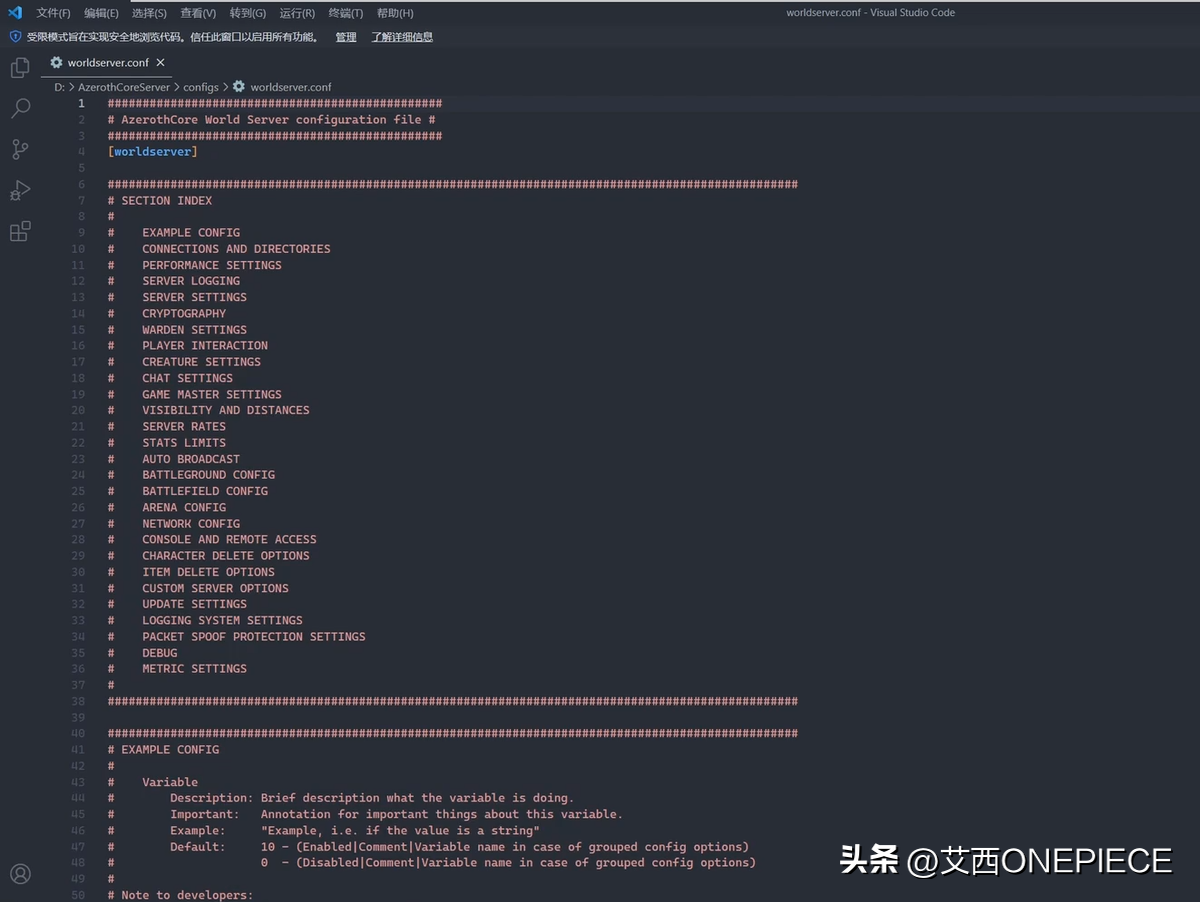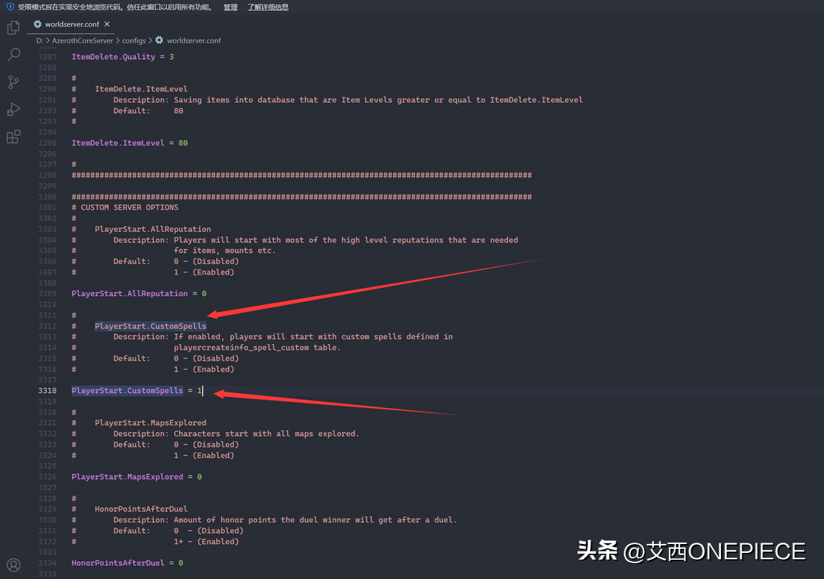 因客户端一般是不会去读取playercreateinfo _spell_ custom表项所以我们自己启用下配置文件 在AzerothCoreServer>configs 目录找到worldserver.conf文件用vs程序打开