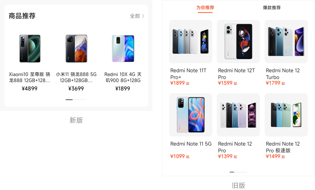 另外值得说的一点是,手机腰带下面三个手机做到了“千人千面”,不同标签的用户会看到不同的手机推荐。