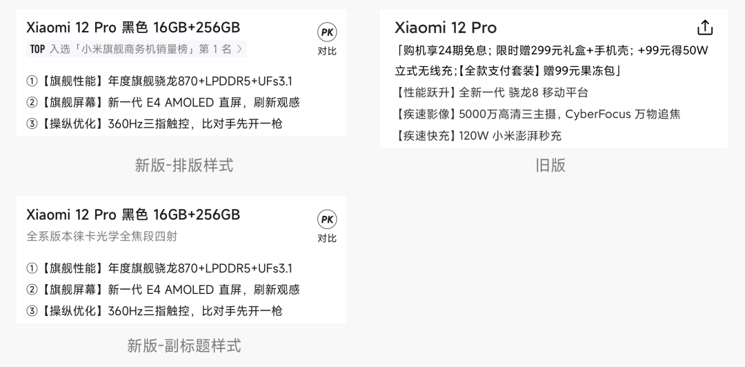 卖点就是展示这个产品本身的亮点,利益点是这个产品有什么优惠,对于刚发布的新品就直接上利益点,有损新品的价值感,不符合我们“回归产品” 的设计语言。