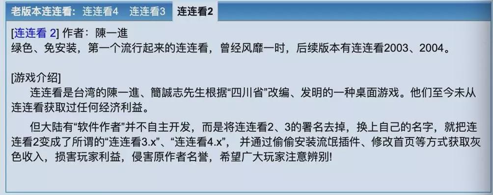 到《连连看4》为止,它一直是在官网免费提供。在网络上开始出现一些冒名带插件的版本之后,作者甚至在官网上注明已发行的版本,并请大家在官网下载。