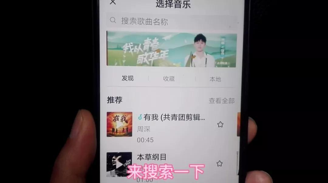 注意看上方有一个“选择音乐”,我们点开,在下面有平台给我们推荐的音乐,我们可以选择自己喜欢的音乐!如果说您的收藏夹里有音乐的话,也可以点开收藏选择你自己的音乐。在右边有一个“发现”的按钮,我们点开,在输入框可以输入你喜欢的歌曲名称,来搜索一下,我们来选择这一首音乐,点后方的“使用”,点一下屏幕立刻就返回了。