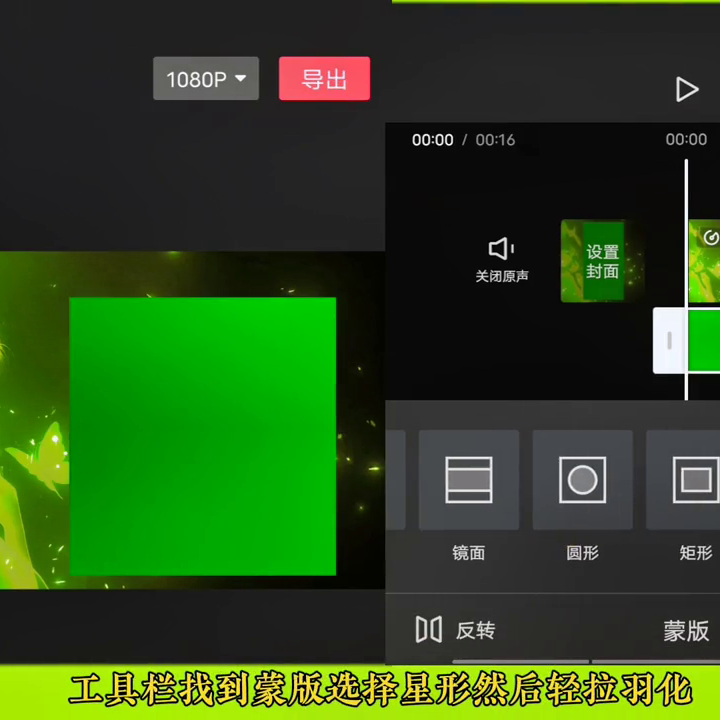 ·将画中画拉到与主视频平齐的位置,然后在编辑选项中点击裁剪,将绿幕素材裁剪成正方形并调整大小。接着,使用蒙版选择星形并轻拉羽化,以创建一个心形蒙版。