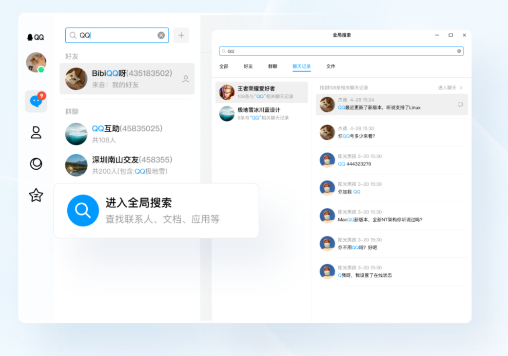 QQ for Linux 版支持全局搜索,快速搜索,便捷全面。