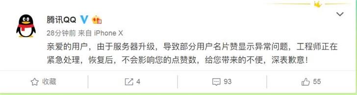 腾讯QQ在官微发布消息称:“亲爱的用户,由于服务器升级,导致部分用户名片赞显示异常问题,工程师正在紧急处理,恢复后,不会影响您的点赞数,给您带来的不便,深表歉意!”
