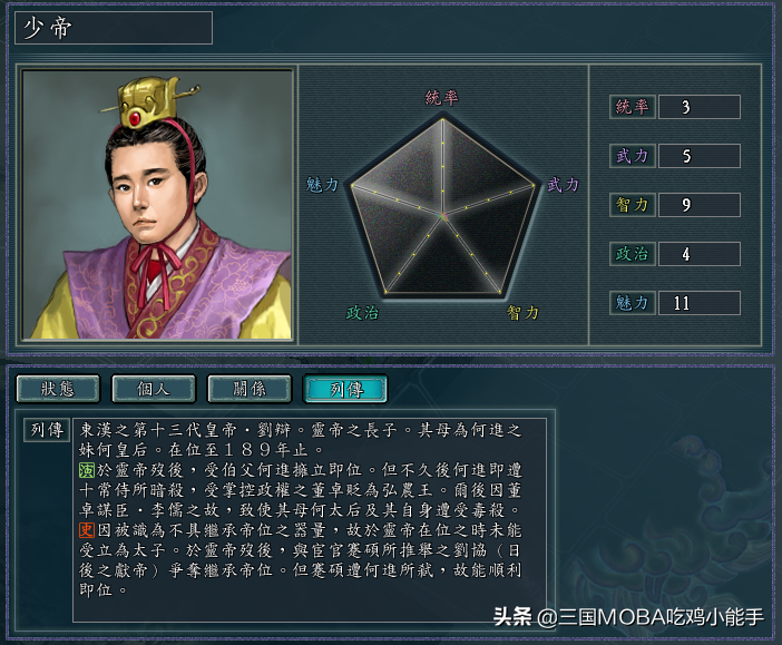 在三国志11里,光荣对于这位最强帝王的理解是政治超绝,智力天赋异禀,实际战场能力相对一般。