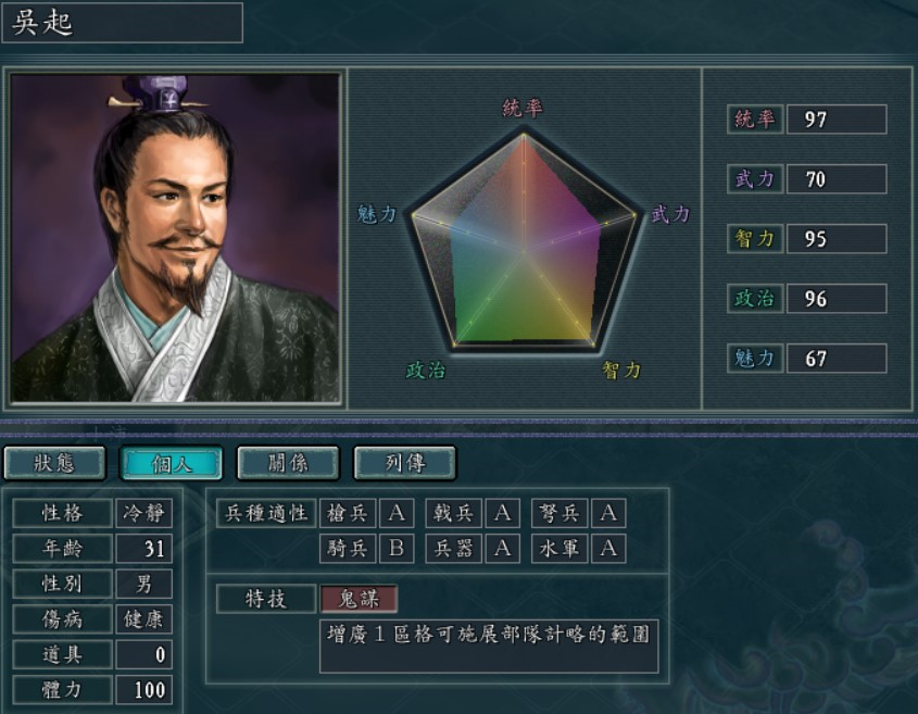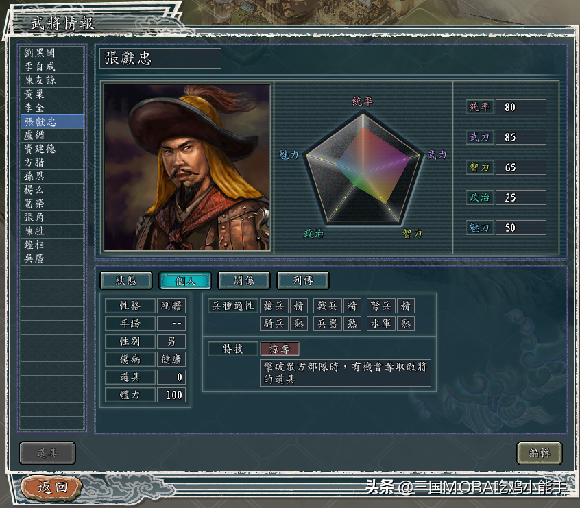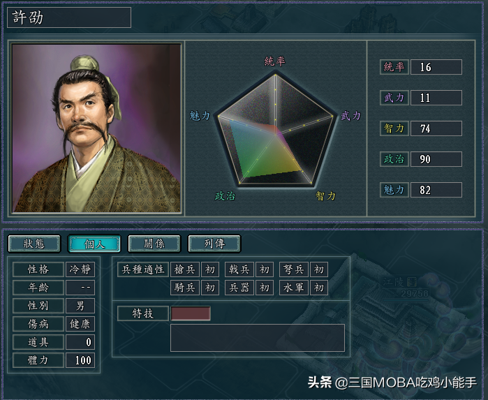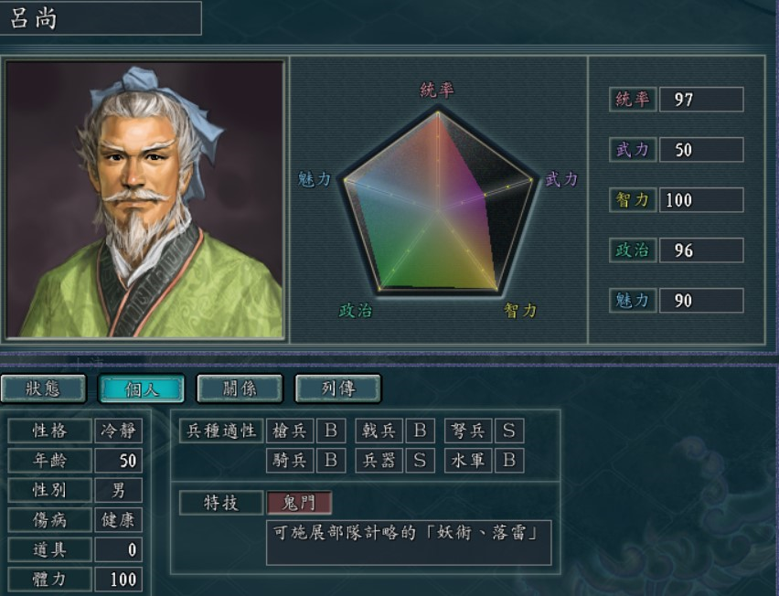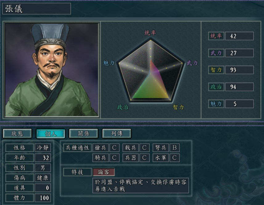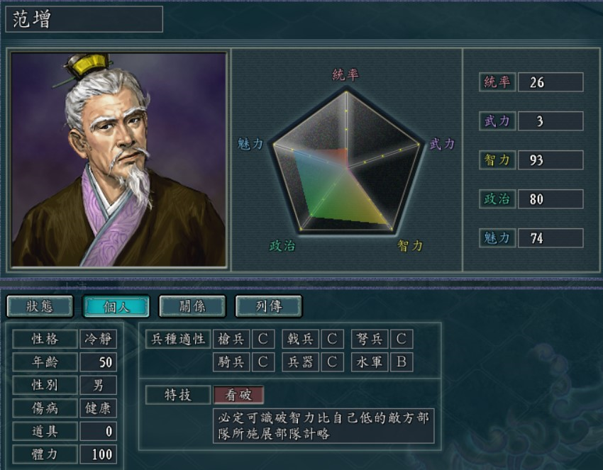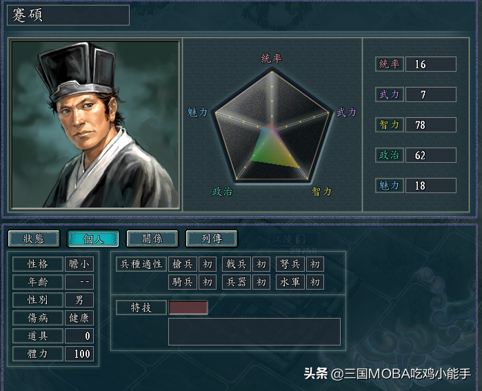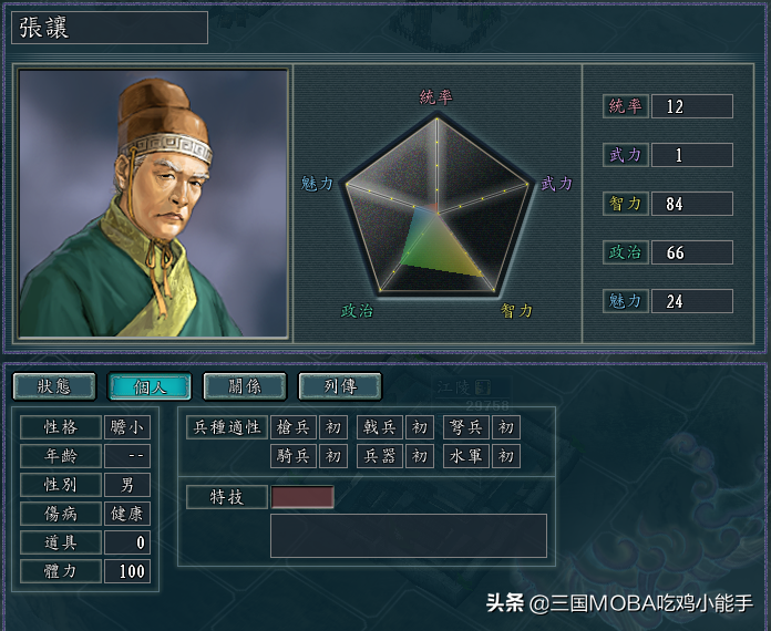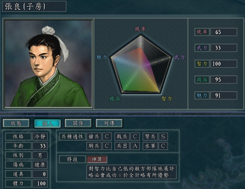 这位历史上的著名军师,与诸葛亮一样都是智力满分,政治和魅力很高,但是武力一般。但是和诸葛亮不同之处在于,张良并没有太多领军打仗,充当统帅的精力。所以统帅一项的数值只有65,也是张良在光荣眼中不如诸葛亮的原因所在。