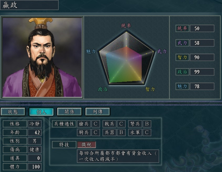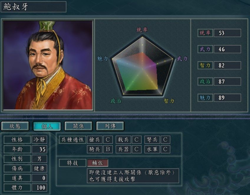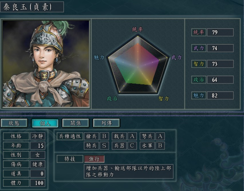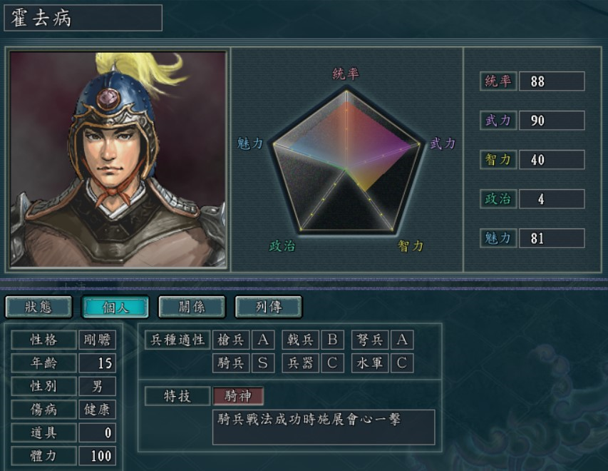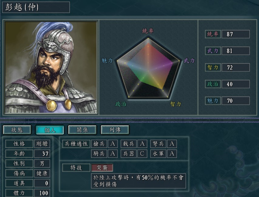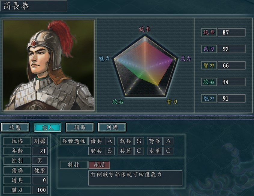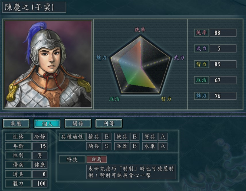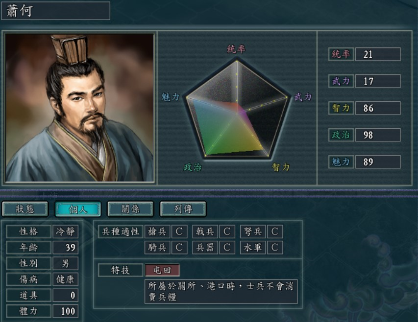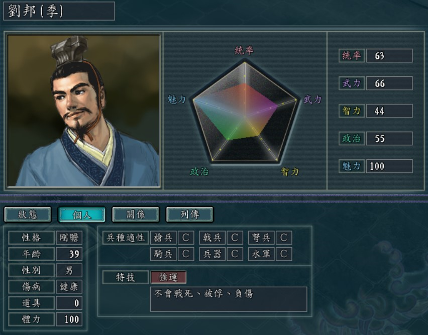 这位历史上的著名军师,与诸葛亮一样都是智力满分,政治和魅力很高,但是武力一般。但是和诸葛亮不同之处在于,张良并没有太多领军打仗,充当统帅的精力。所以统帅一项的数值只有65,也是张良在光荣眼中不如诸葛亮的原因所在。