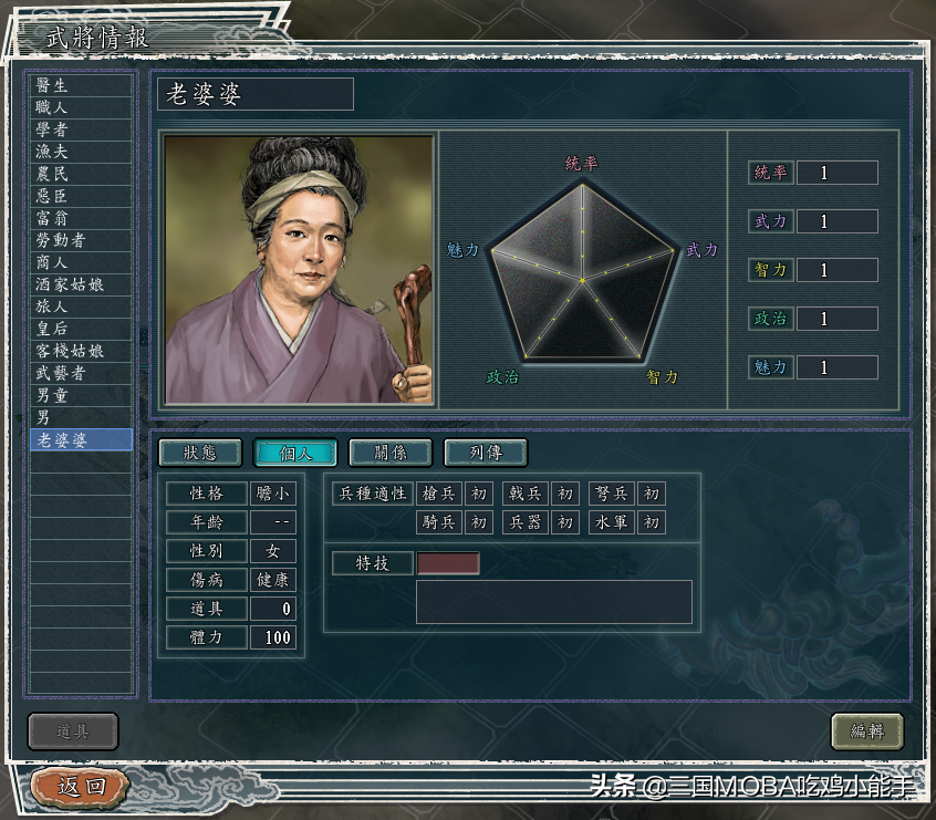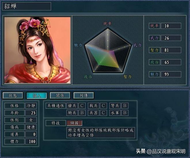 最后提一句,综合属性排名32位,五维总和达到396的秦良玉,成为包含历史名将在内,所有三国志11里女武将综合属性排名的第一人。而从属性上看,秦良玉则是属于那种全能型的多面手,哪怕让她当一个女太守也是绰绰有余地。