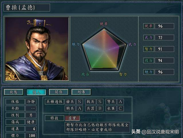 换句话说,除了与敌人单挑之外,曹操在战略战术内政外交多个维度上,都是一把好手。可以说是最全面也最好用的武将(君主)。