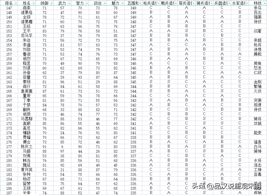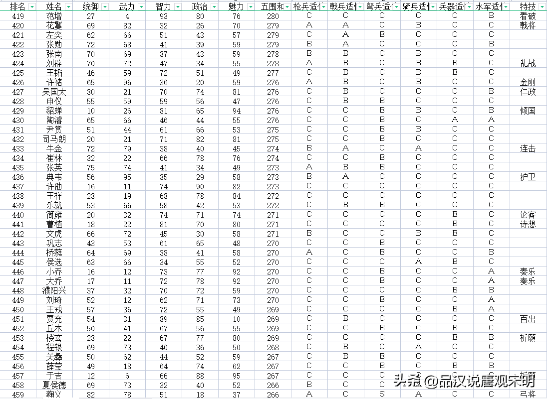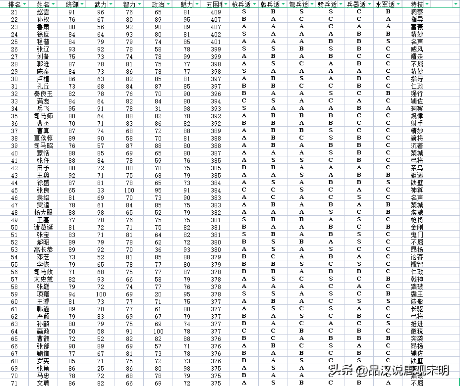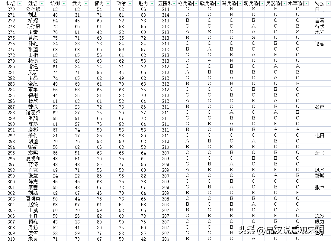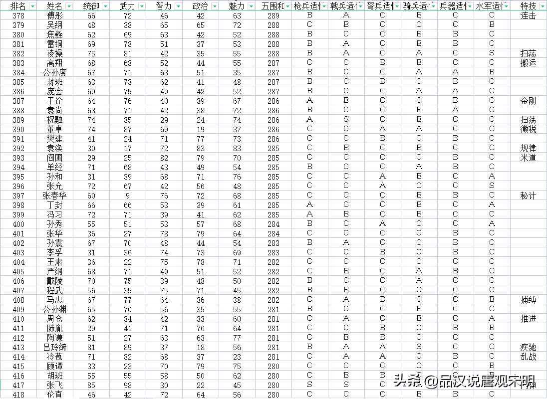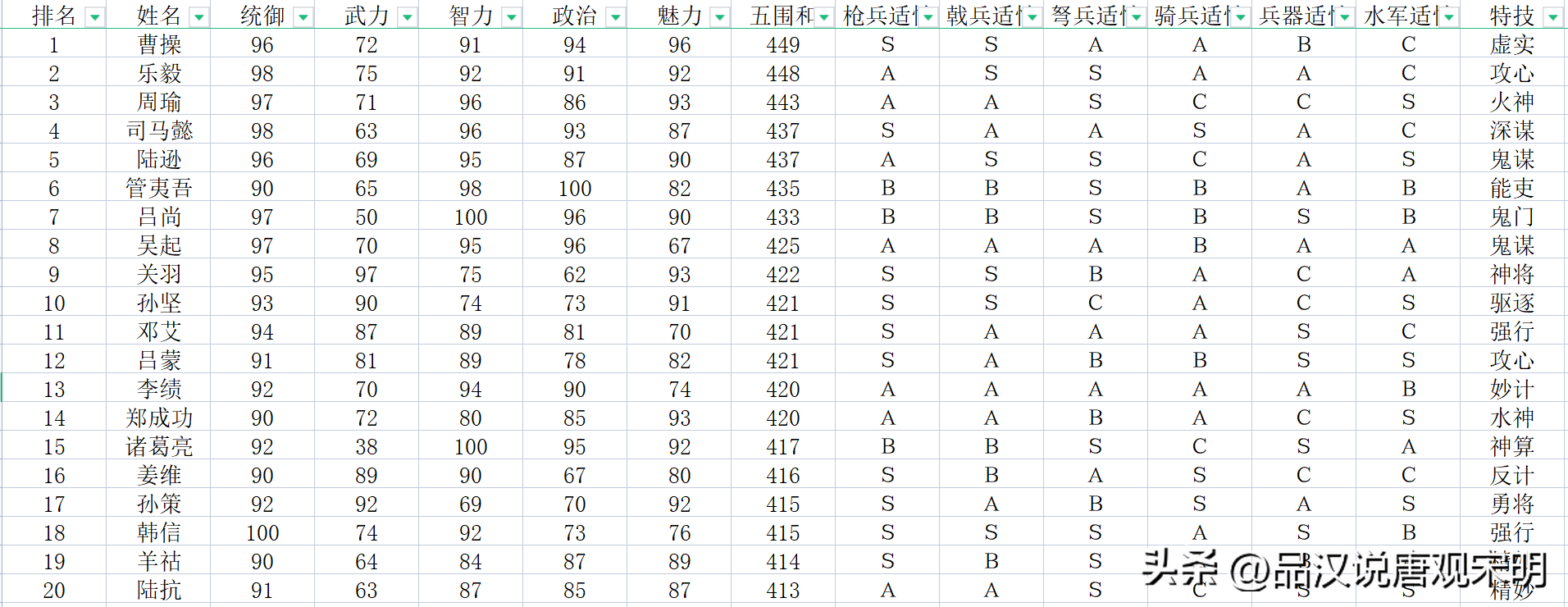 哪怕是排名第二十位的羊牯,综合属性也达到了413点,平均下来是82.6点。所以能够在这个表单里的武将,基本上都是全面型人才,至少也是统帅方向(统帅、武力、智力)或内政方向(智力、政治、魅力)的全才。
