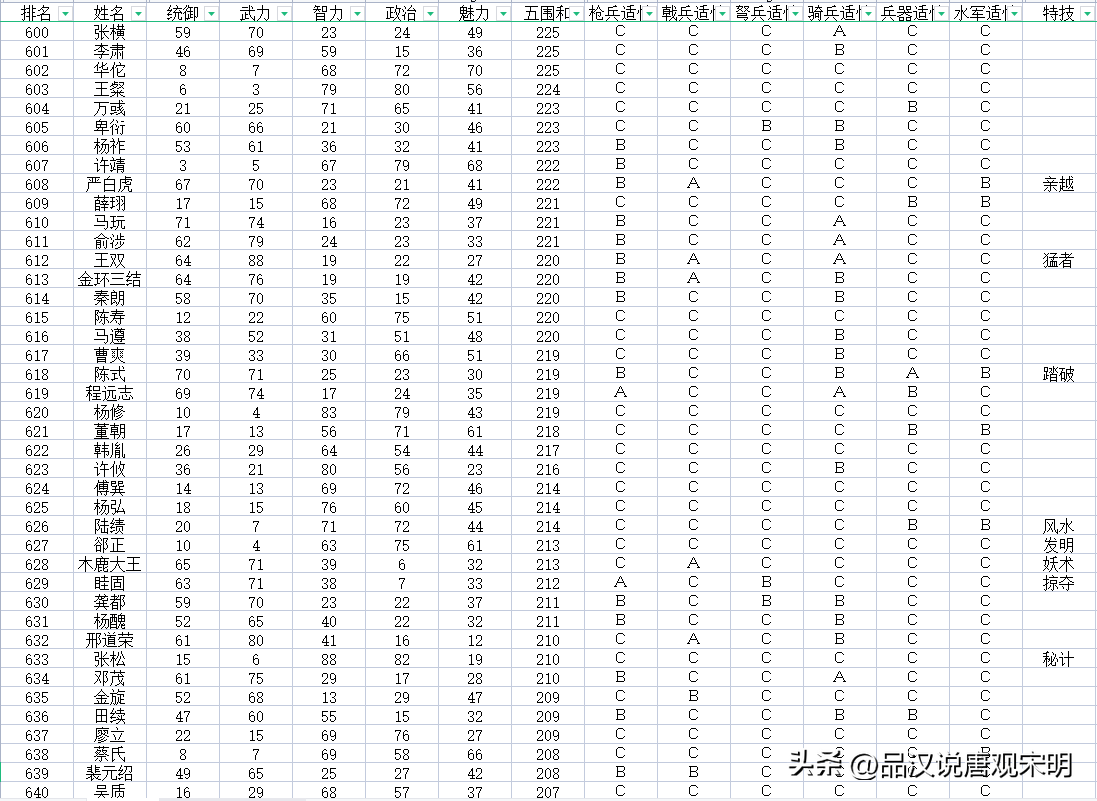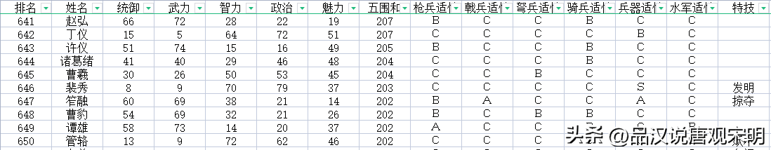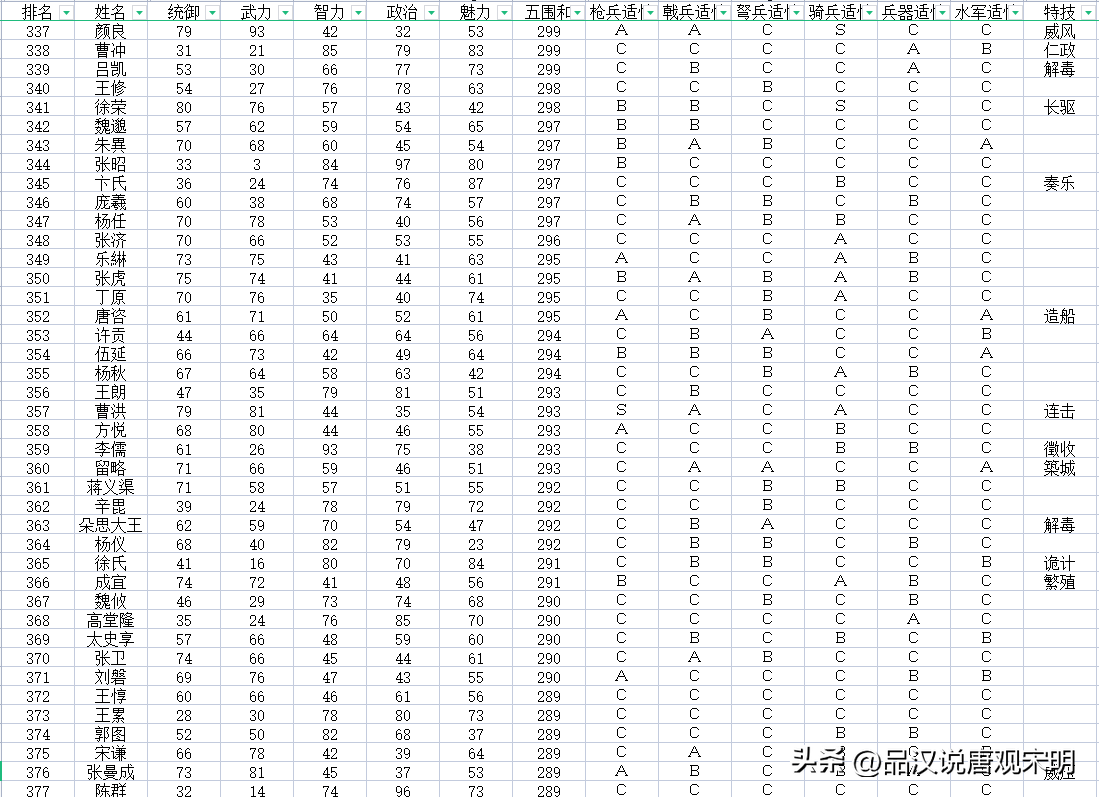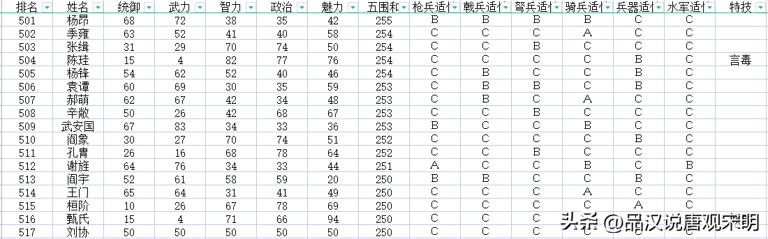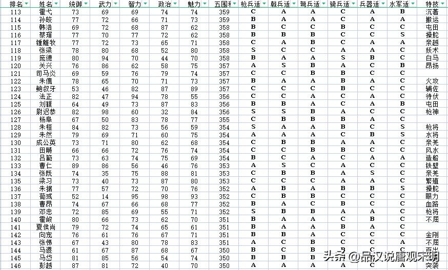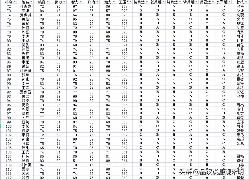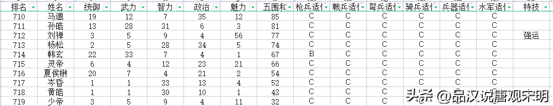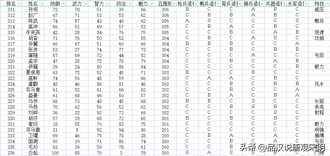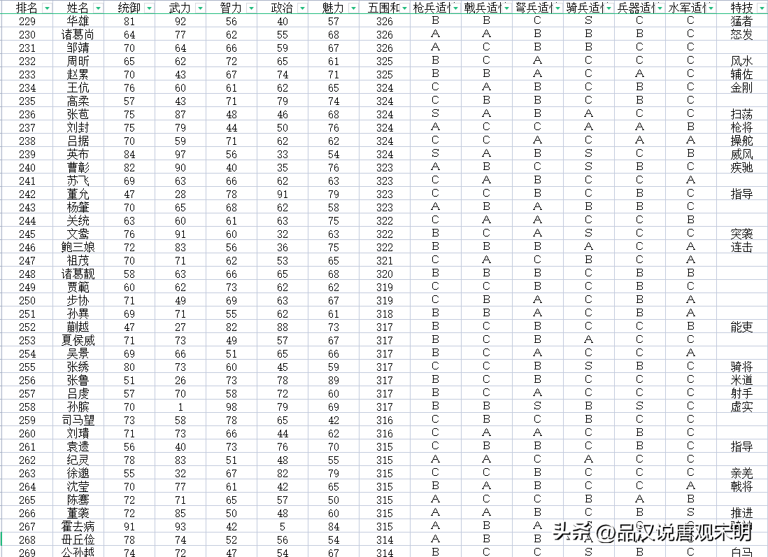 哪怕是排名第二十位的羊牯,综合属性也达到了413点,平均下来是82.6点。所以能够在这个表单里的武将,基本上都是全面型人才,至少也是统帅方向(统帅、武力、智力)或内政方向(智力、政治、魅力)的全才。
