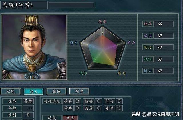 综合属性并不差,起码在蜀汉后期,马谡算得上是除了姜维综合能力最全面也最高的武将了。但是除了87的智力之外,其他四项60多点的属性,也真的很难支撑马谡能面对那么大的局面。