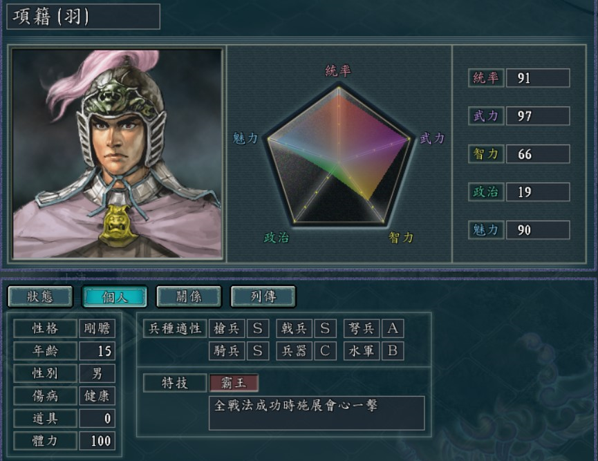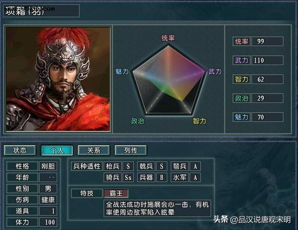但是和岳飞一样,一看政治......20,这个基本上就是低于正常人的政治水准了。同样如果这里提升到三国相对合理的60点,那么项羽也与岳飞一样,能够直接进入前十水准。