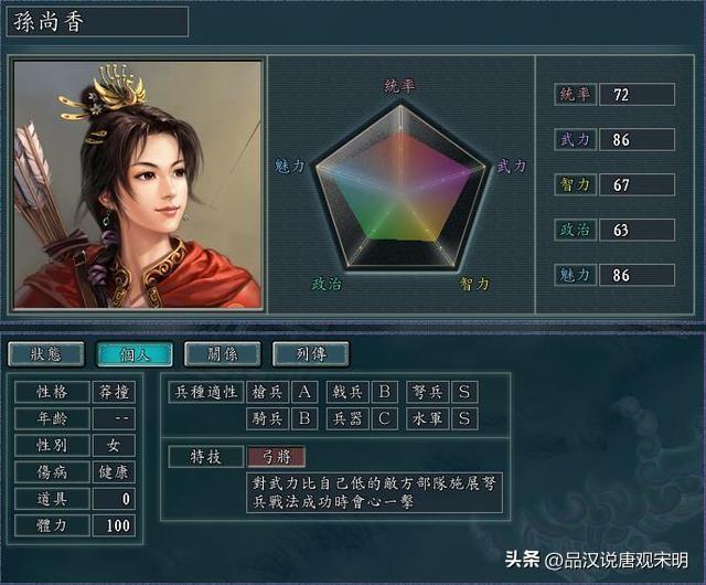 尤其是武力,孙尚香的武力数值,基本上相当于纯武力流里二线名将的水平了。比之曹仁、曹洪、乐进等一大批名将武力都要高。