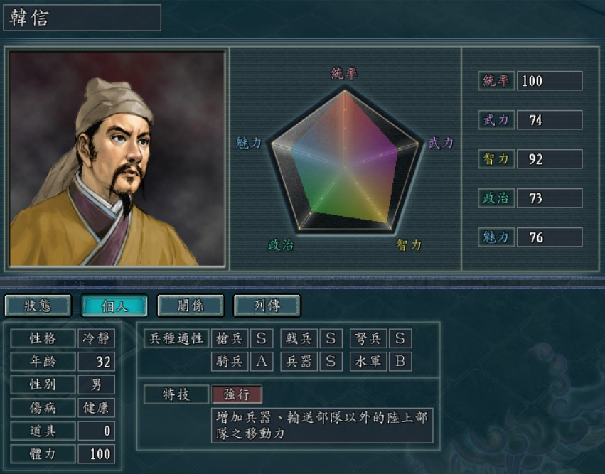 至于三位历史名将,李绩基本没啥争议,郑成功则是有点虚高,至于韩信,虽然光荣眼里他的政治敏感度不足,魅力也不够。但是唯一一个统帅100足以说明韩信的战场能力有多强了。