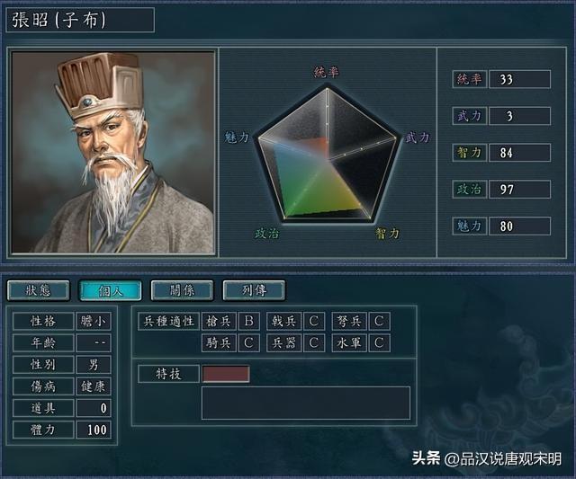 比如政治(97)SSS级,但是武力(3)儿童级的张昭。