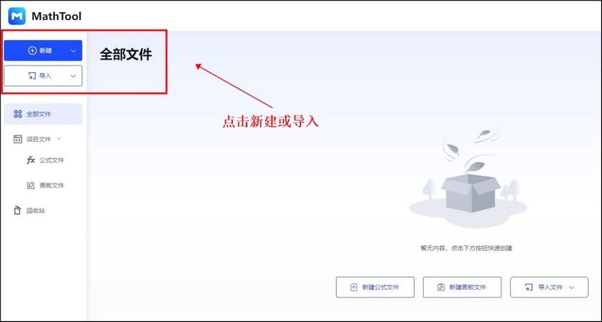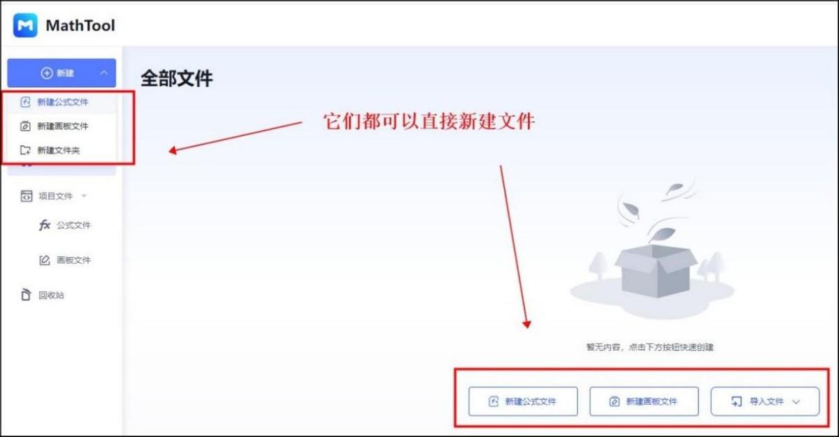 点击后,我们可以选择新建文件的类型:公式文件或者画板文件。如果我们想快速创建的话,下方也可以直接创建,我们按自己的需求点击。