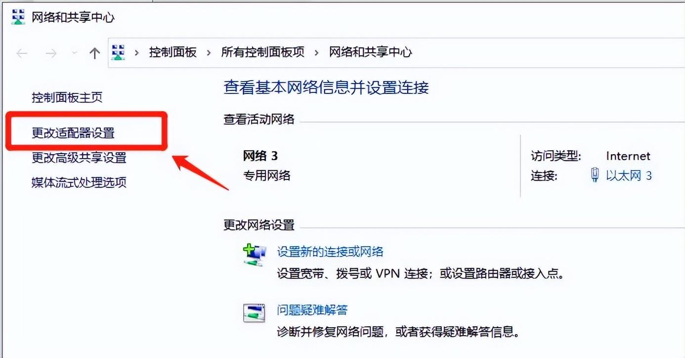第三步:进入网络和共享中心页面,点击左侧的【更改适配器设置】。