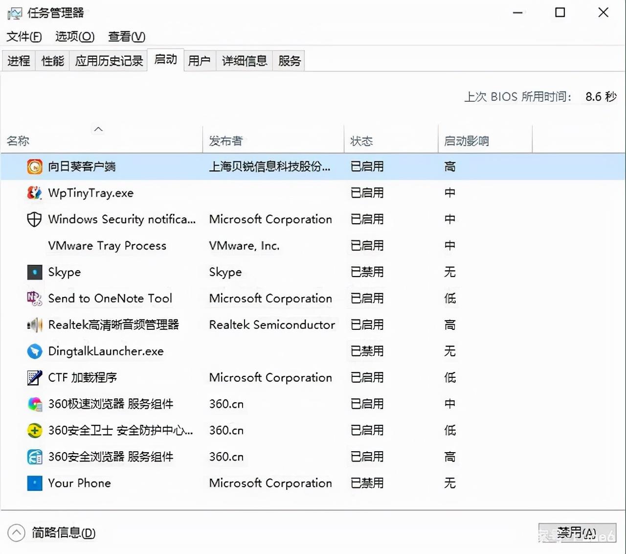 第二步:根据自己使用情况选择不需要开机启动的程序并禁用该启动项即可实现开机启动项的调整。